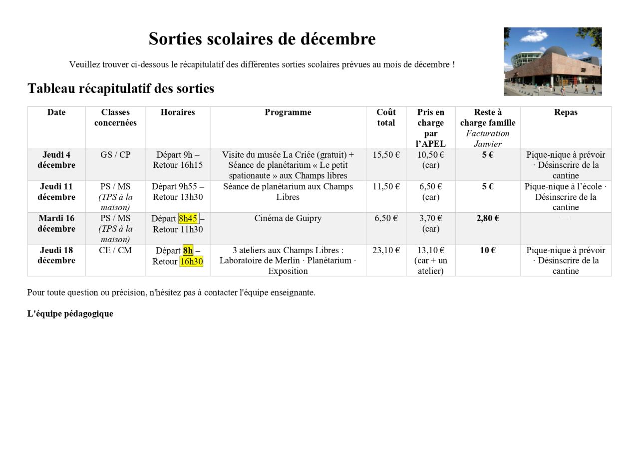 Sorties scolaires de décembre